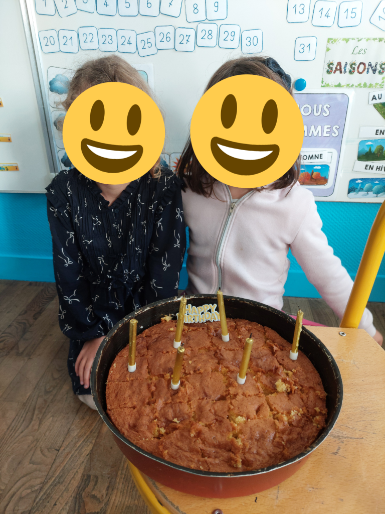 Ces dernières semaines, nous avons étudié l’album : « Le loup qui découvrait le pays des contes ». C’est l’histoire d’un loup qui rêvait, non pas de manger les héros des contes traditionnels, mais plutôt de faire un gâteau aux pommes ! Au gré de ses rencontres, il nous a fait découvrir les ingrédients de la recette du gâteau aux pommes de Tatie Rosette. Il nous a tellement donné envie de goûter son gâteau, que nous avons entrepris de réaliser cette recette pour fêter les anniversaires du mois. Le gâteau était excellent !